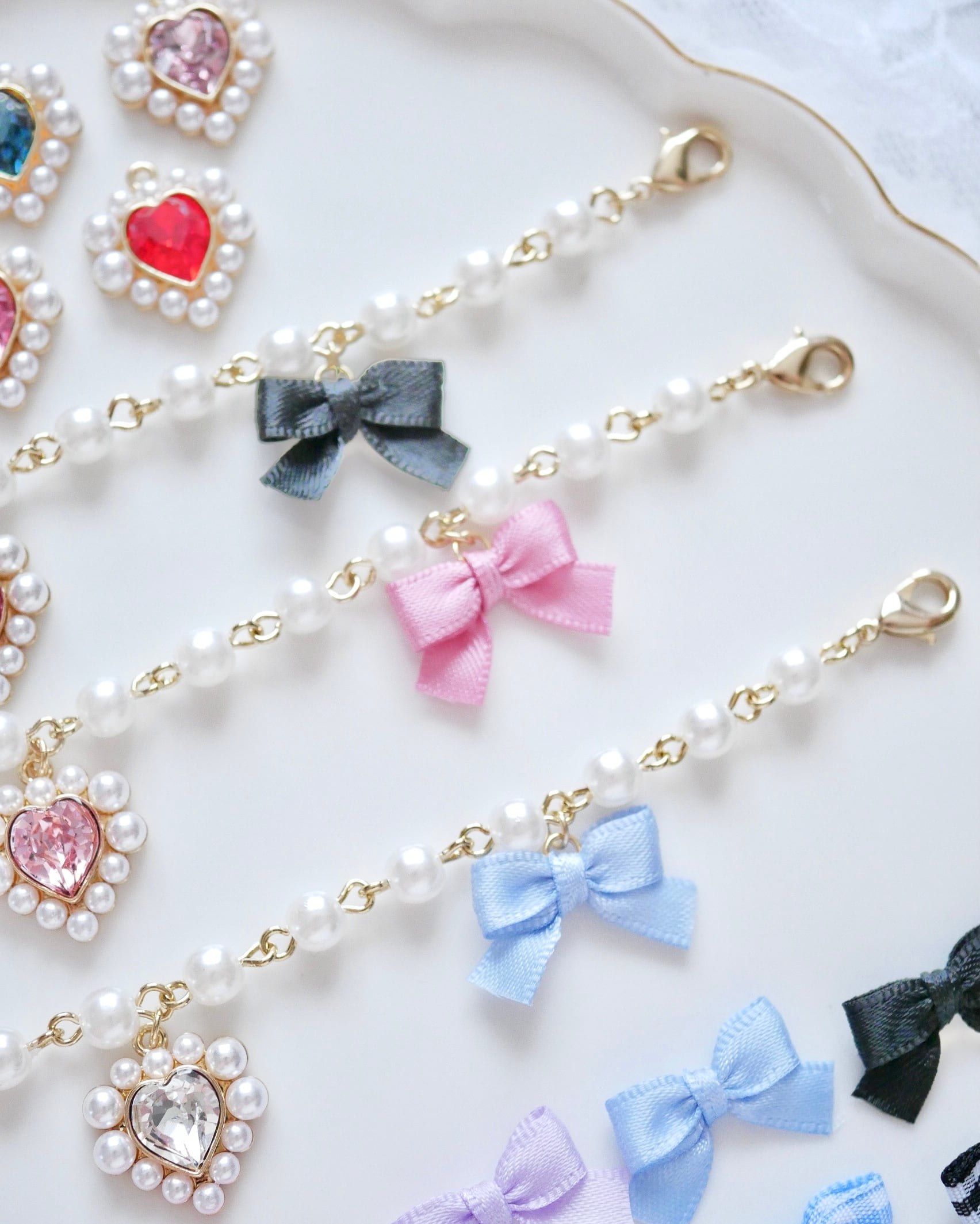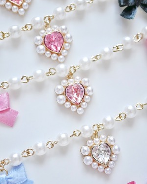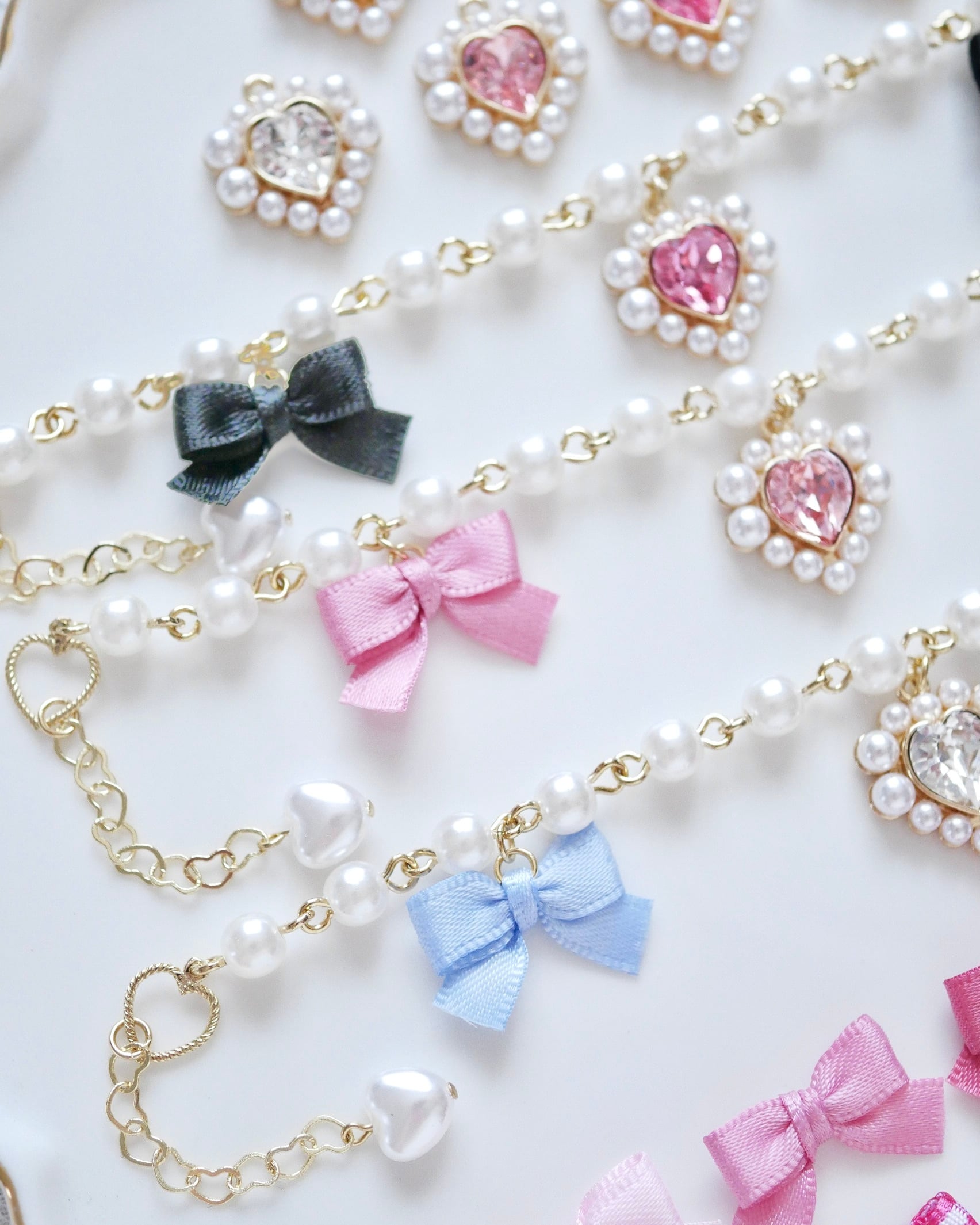 7803 《選べるカラー》パールリボンハートブレスレット/ネックレス