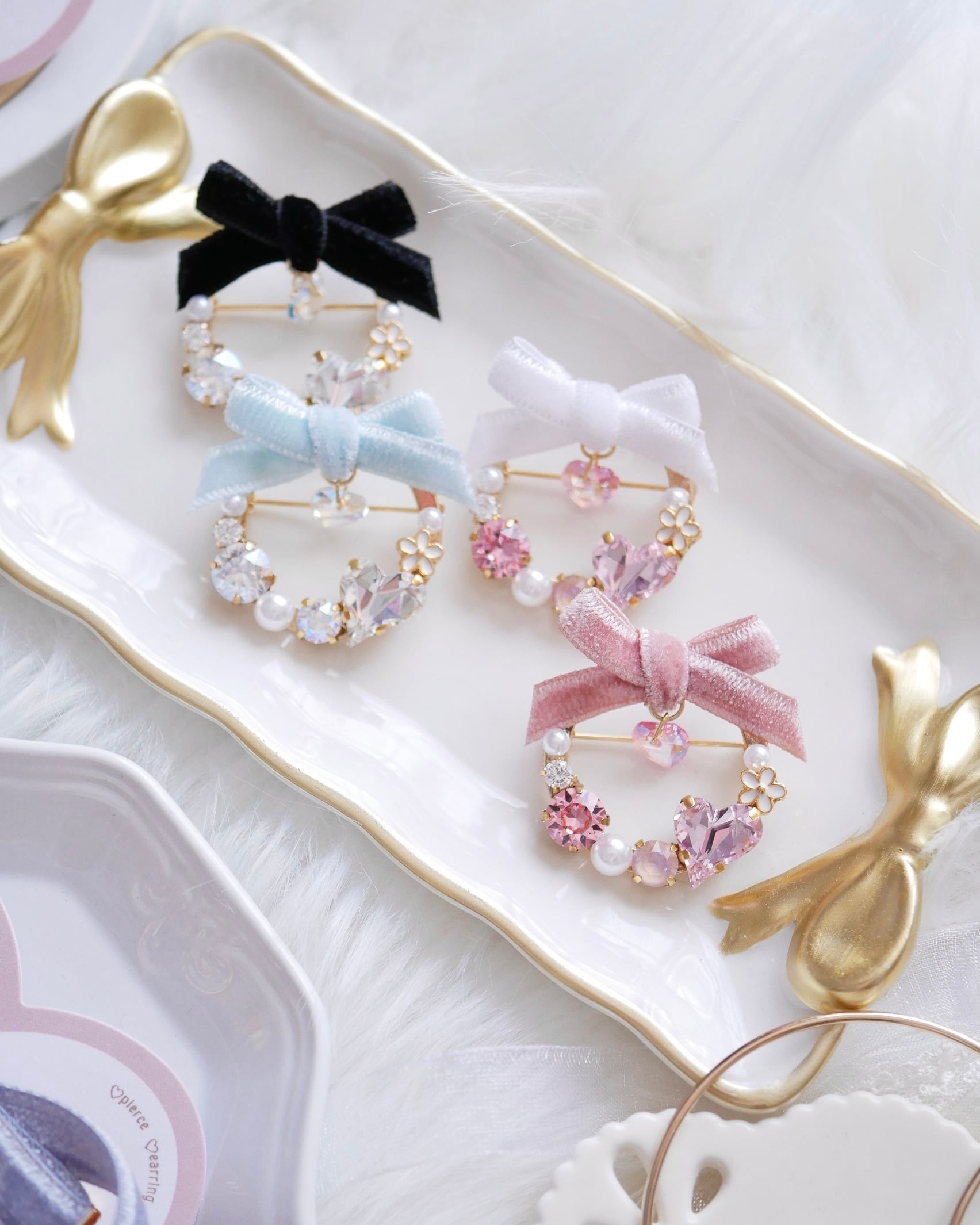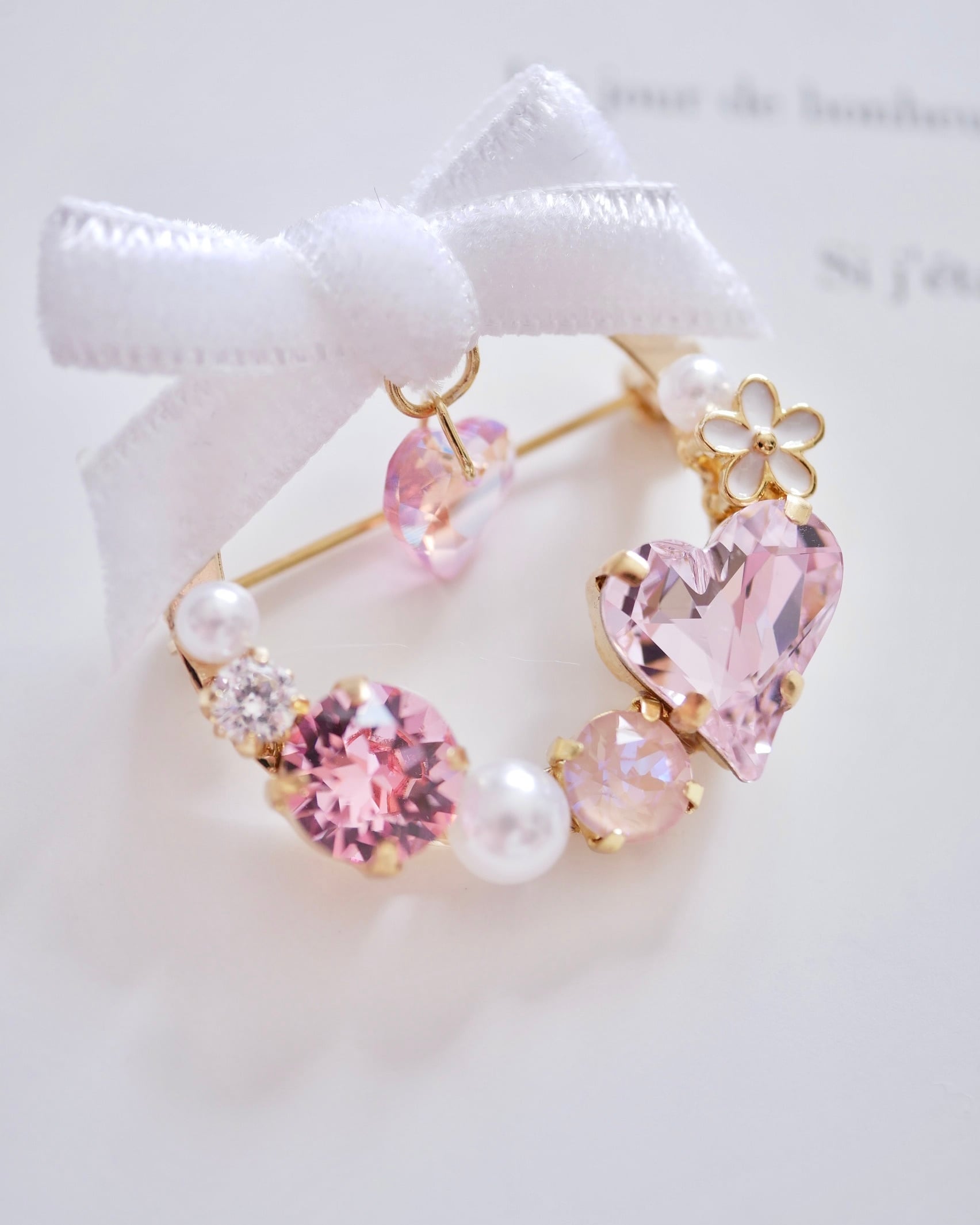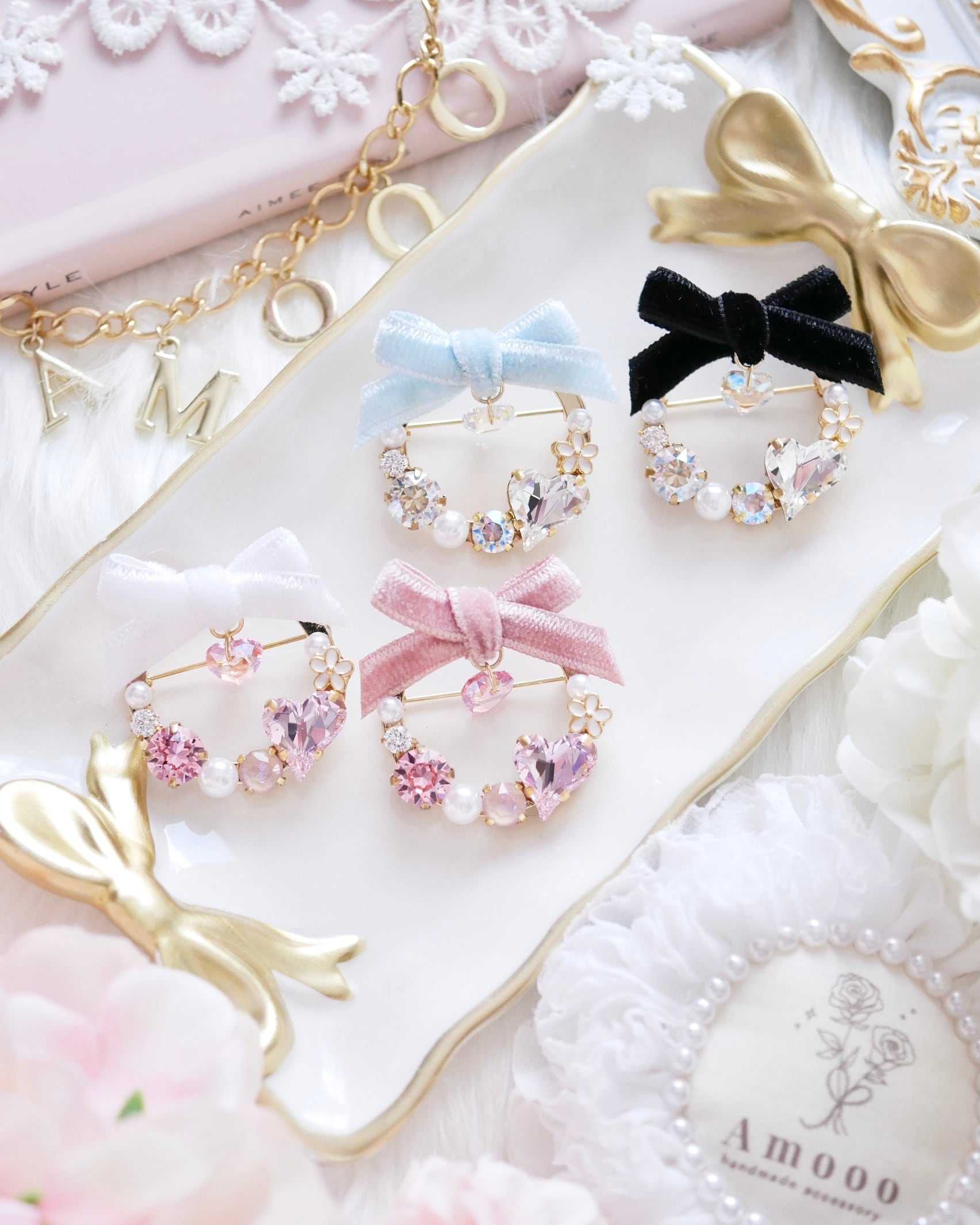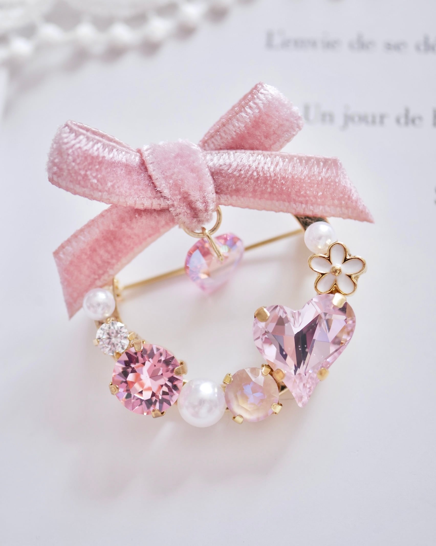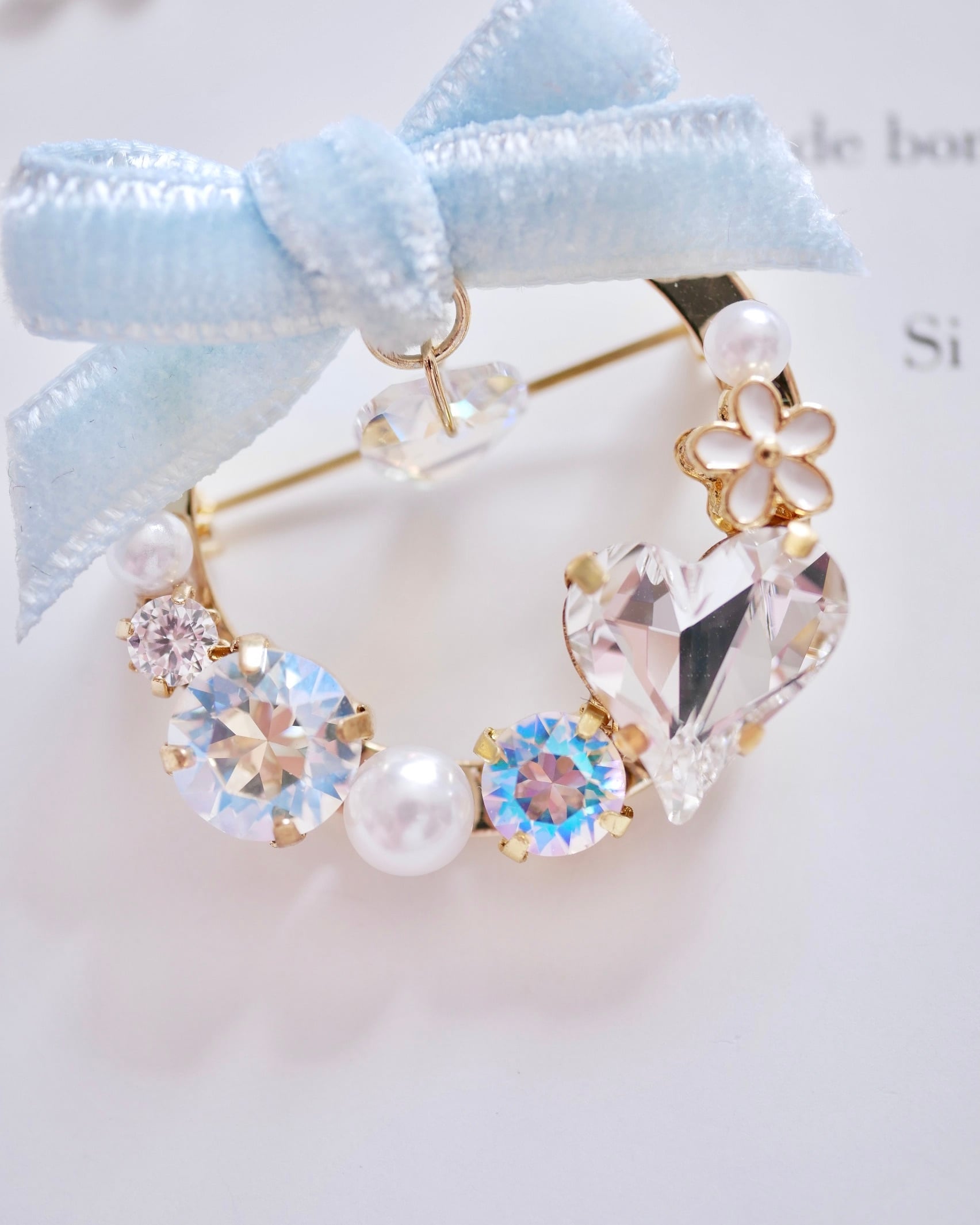 7904 ベルベットリボンクリスタルビジューサークルブローチ