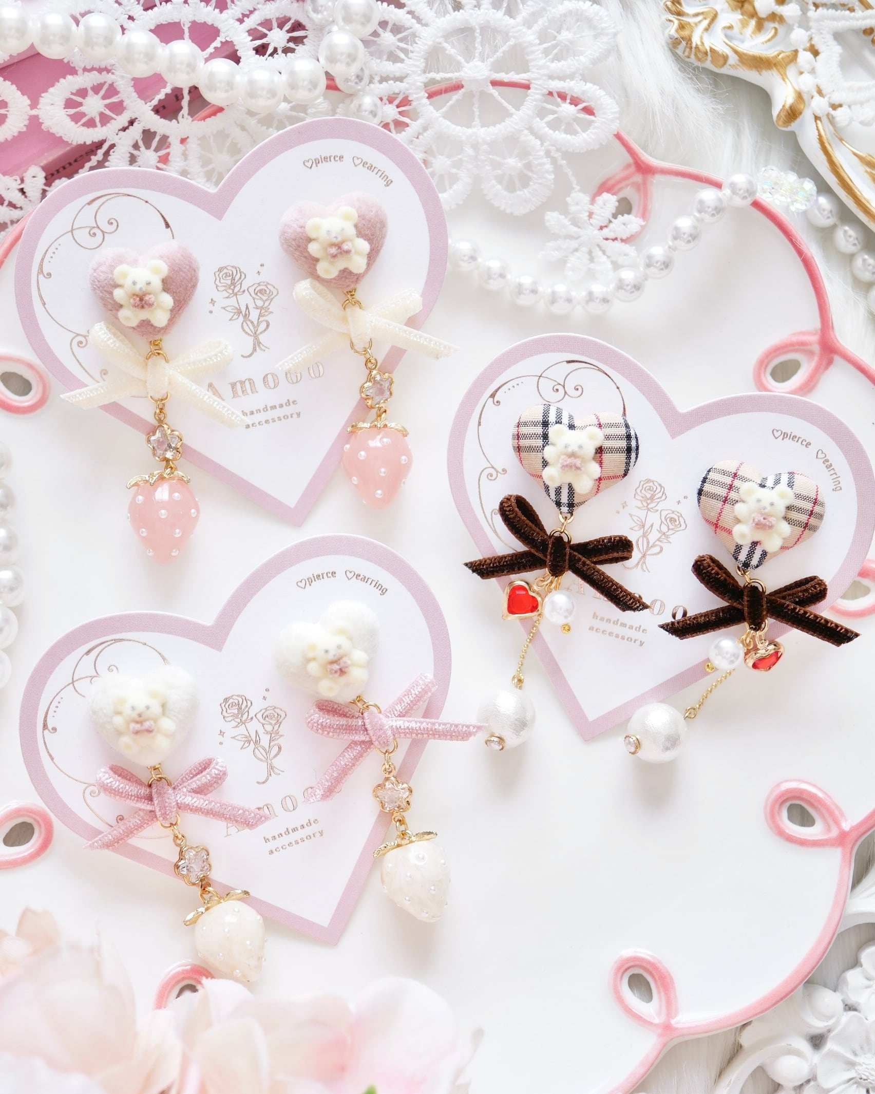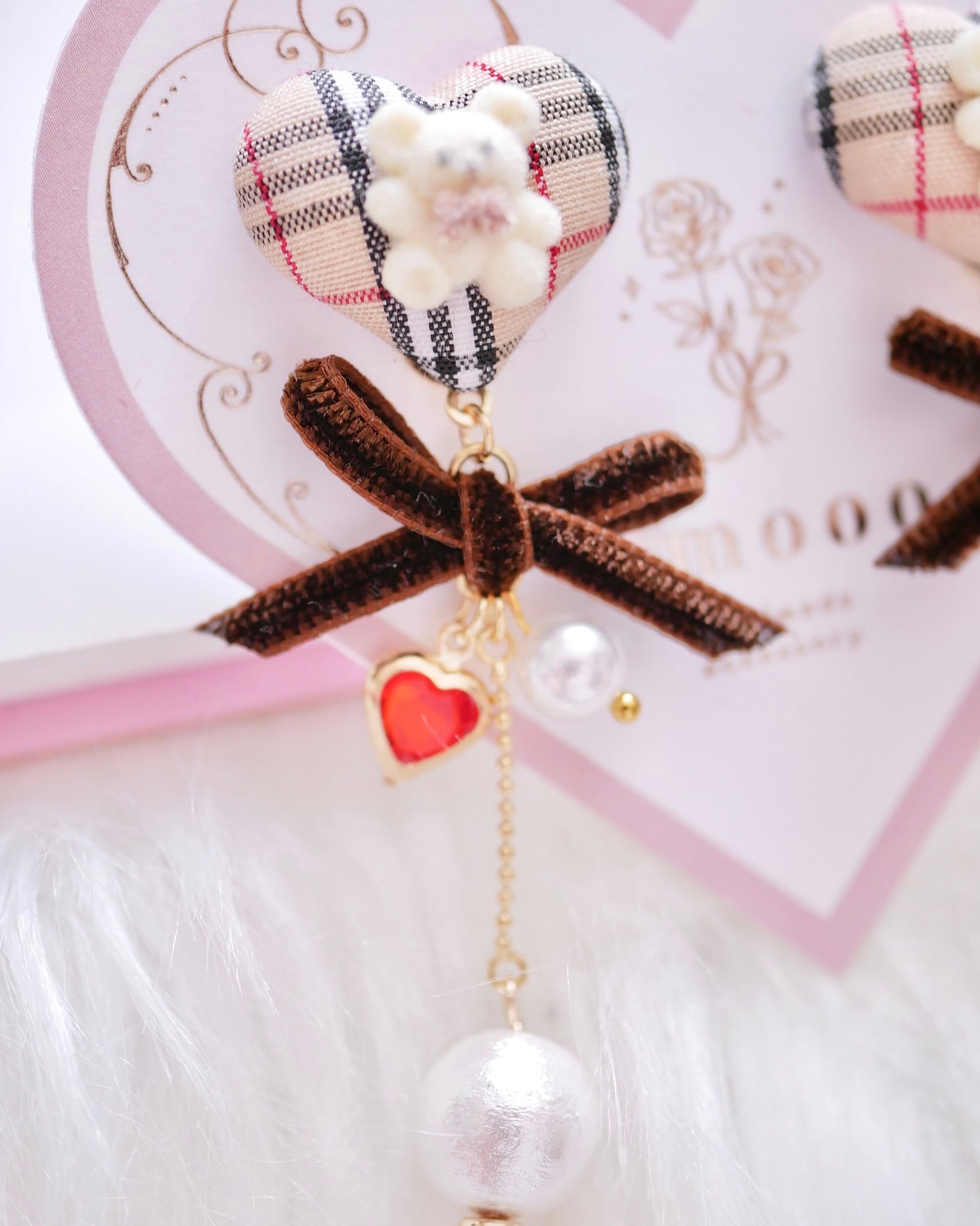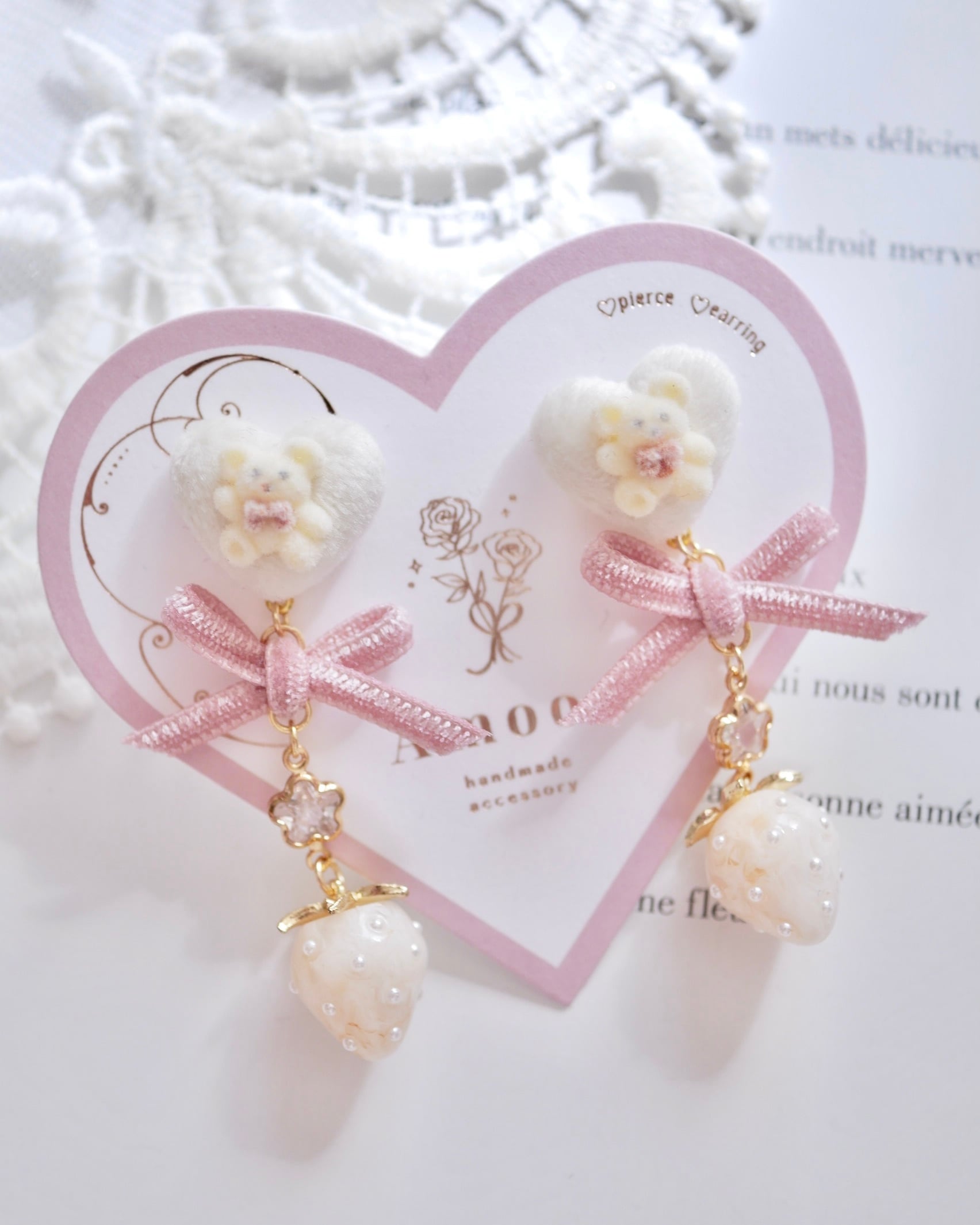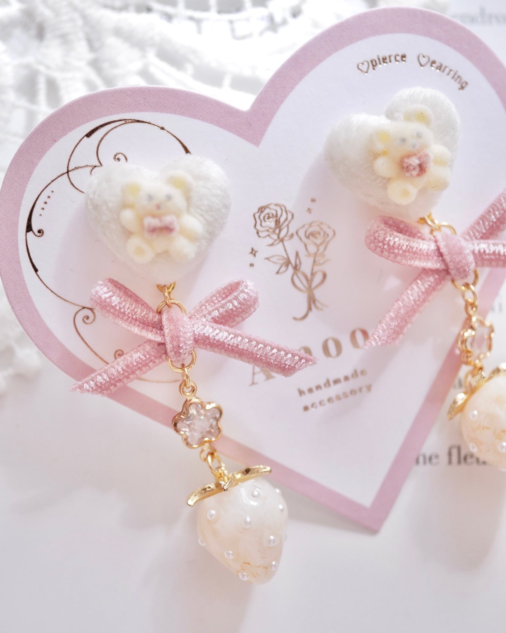 7908 ふわふわくまハートリボンチャームピアス/イヤリング