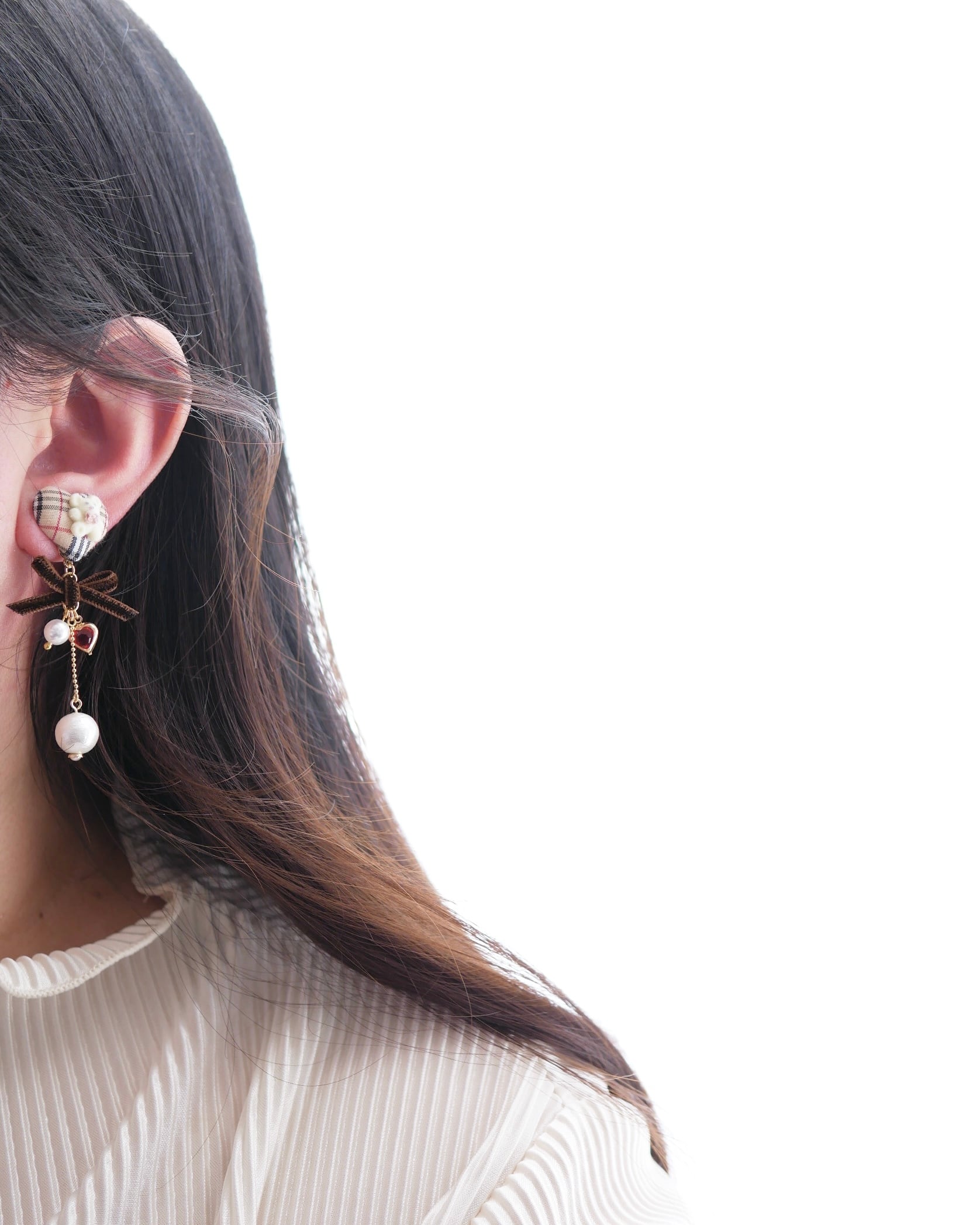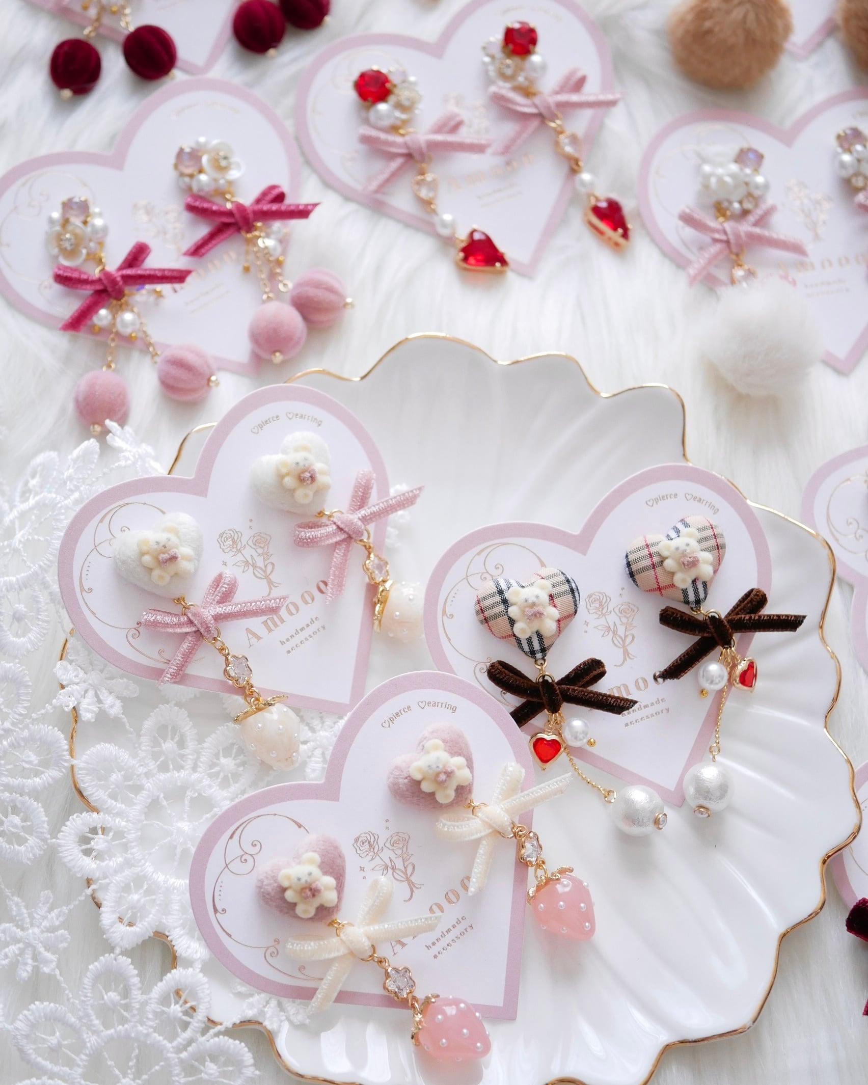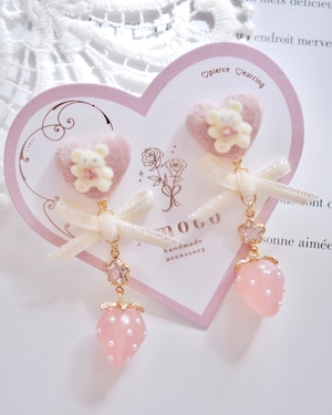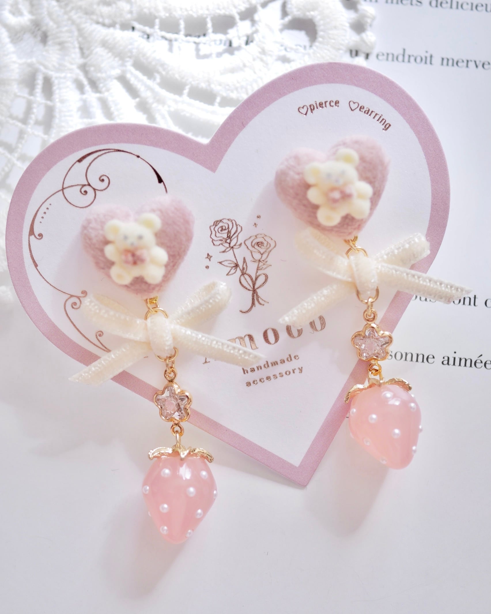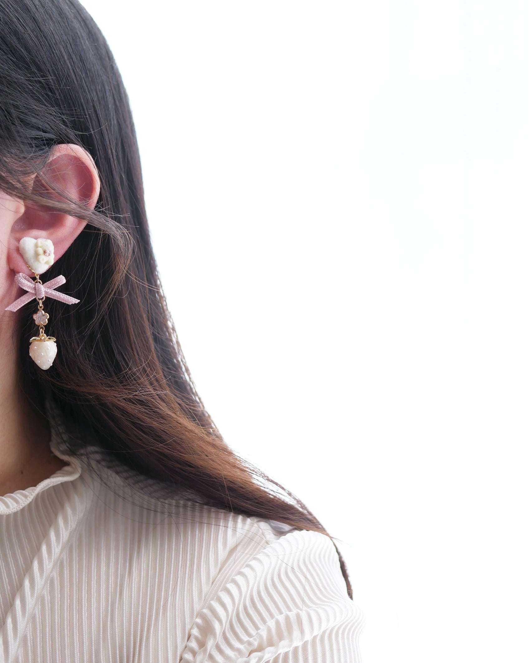 7908 ふわふわくまハートリボンチャームピアス/イヤリング