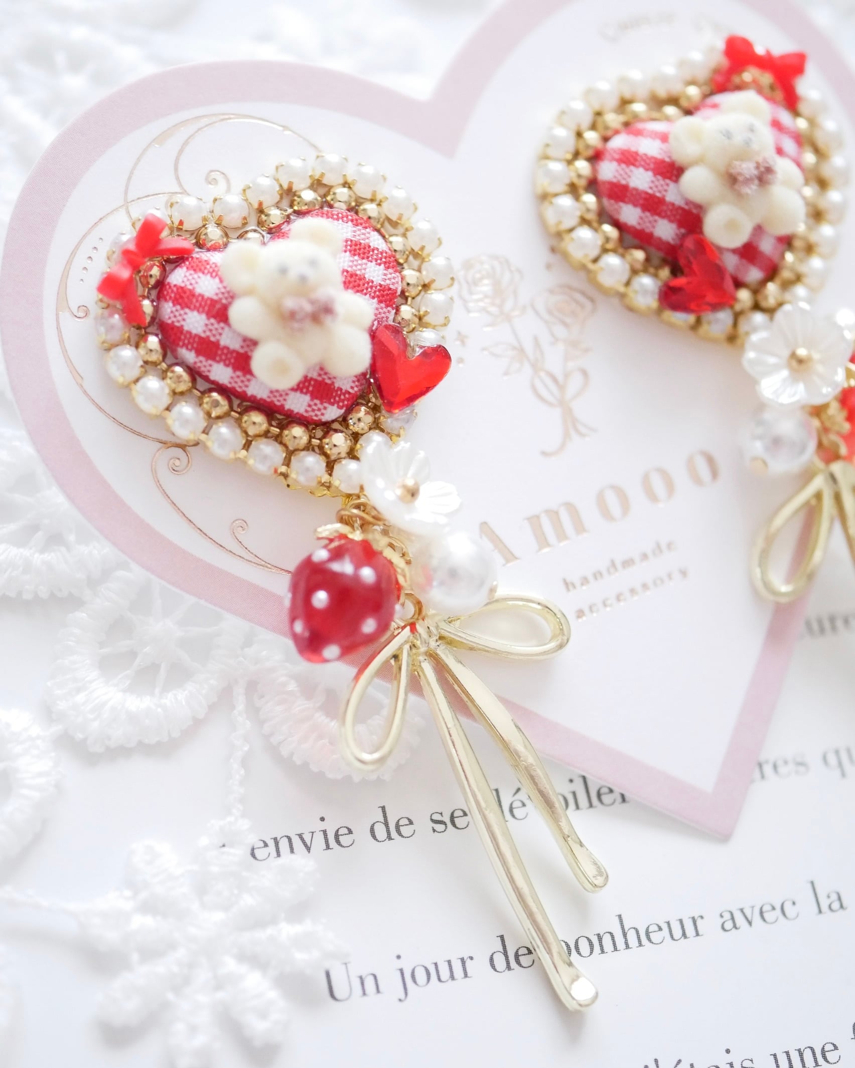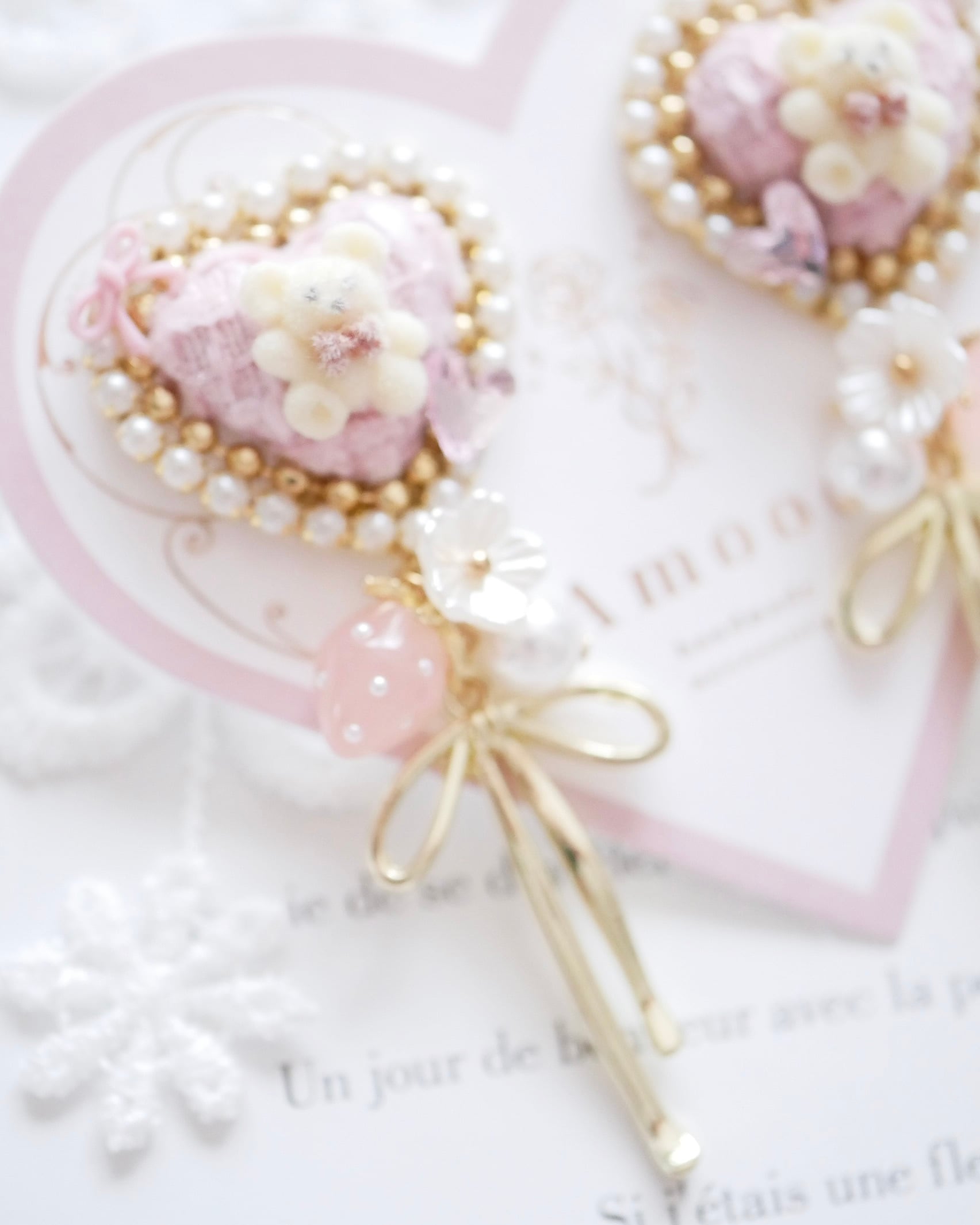 ハートモチーフにくま、リボンにハートと