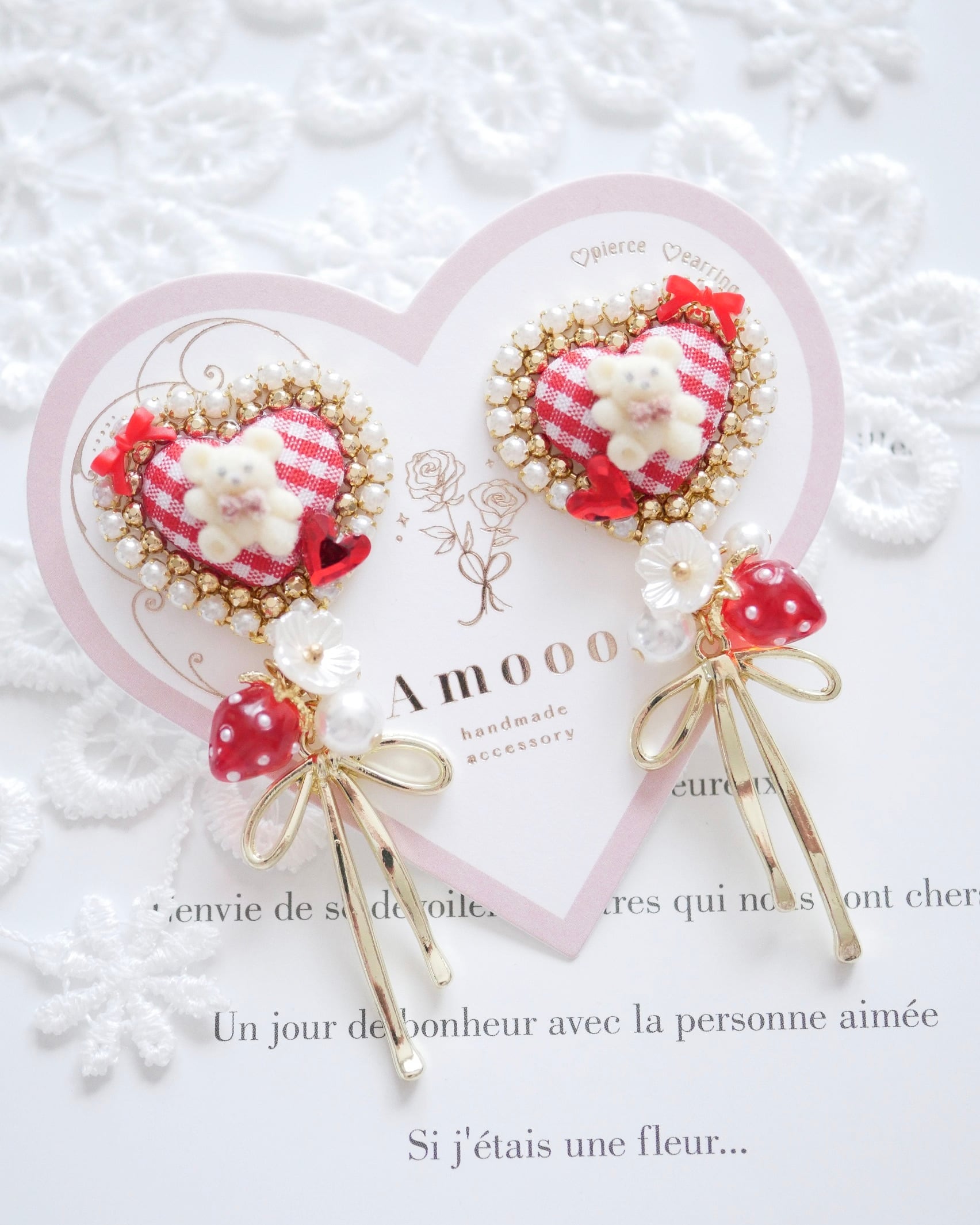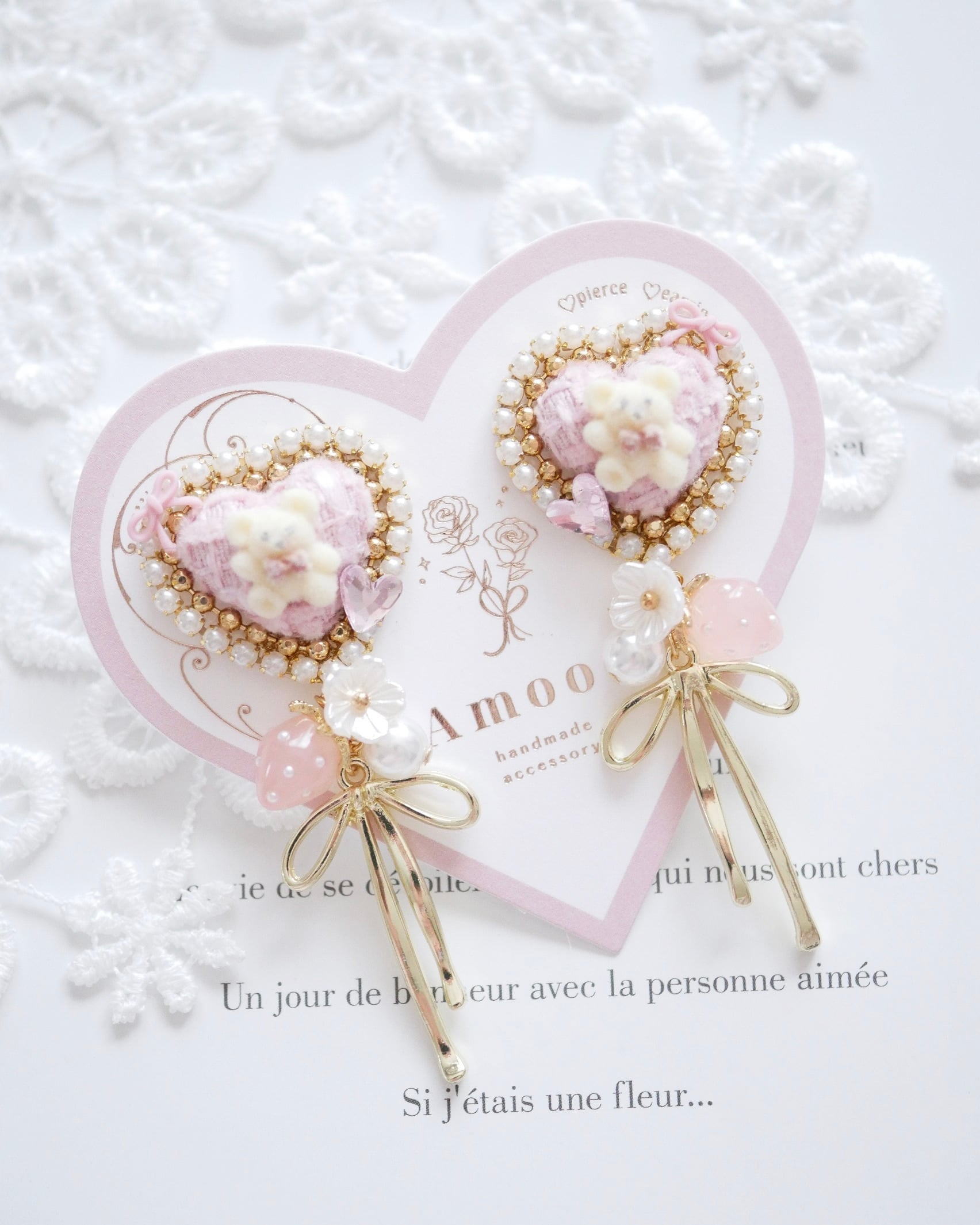 8107 ふんわりベアハートリボンチャームピアス/イヤリング