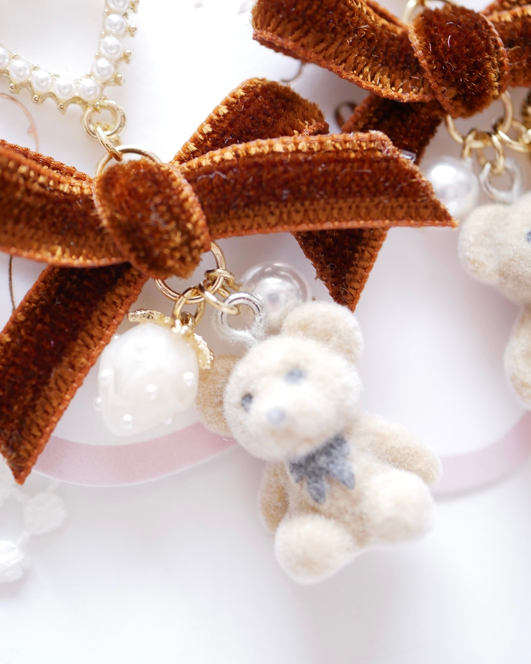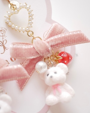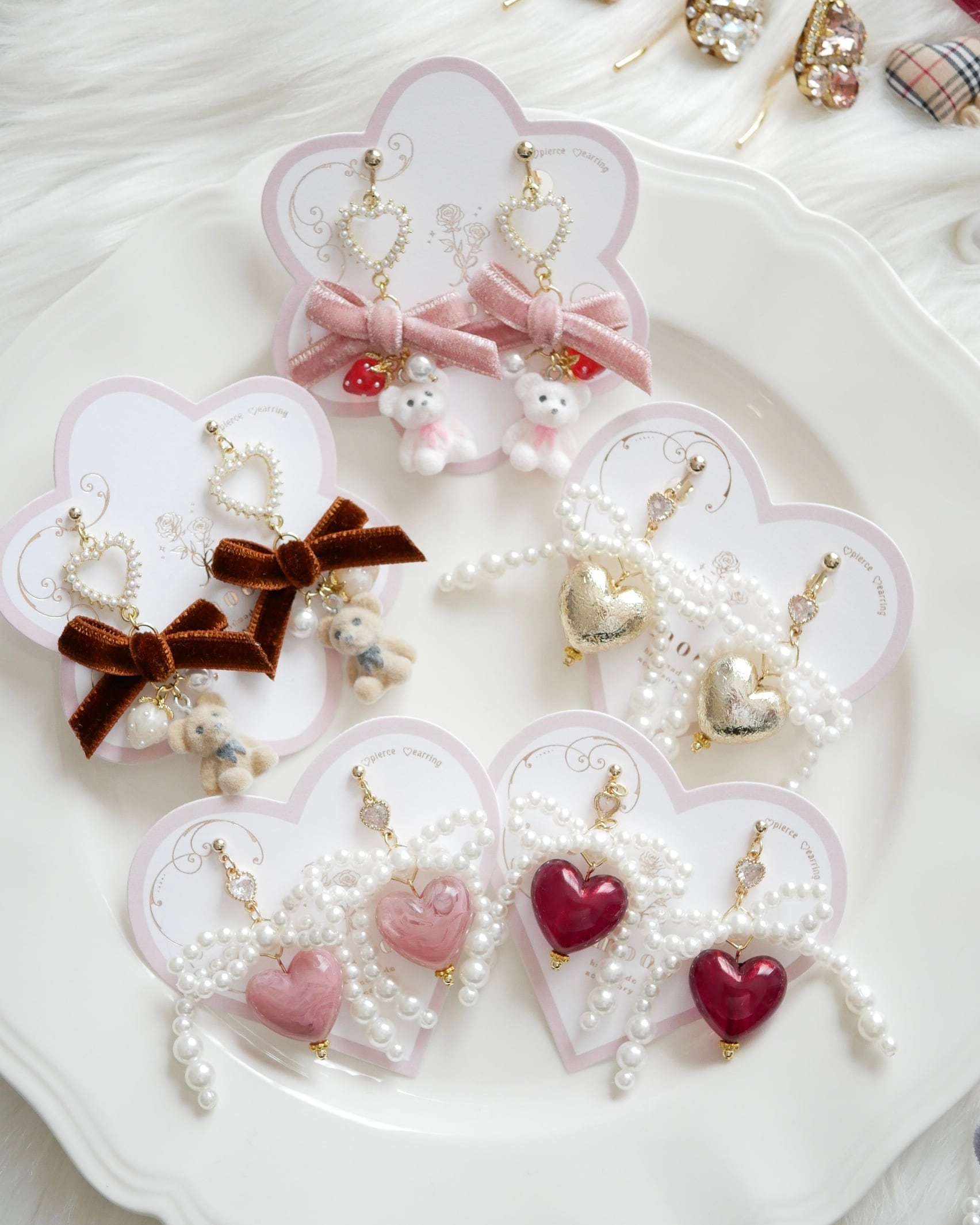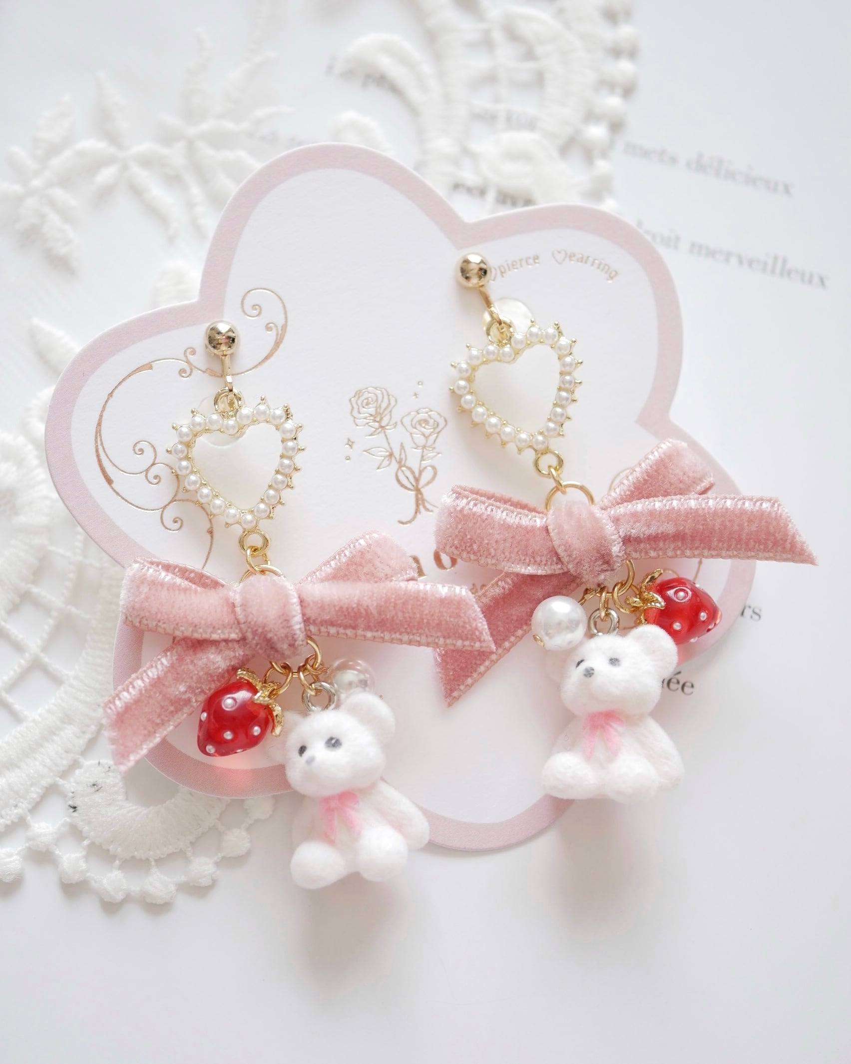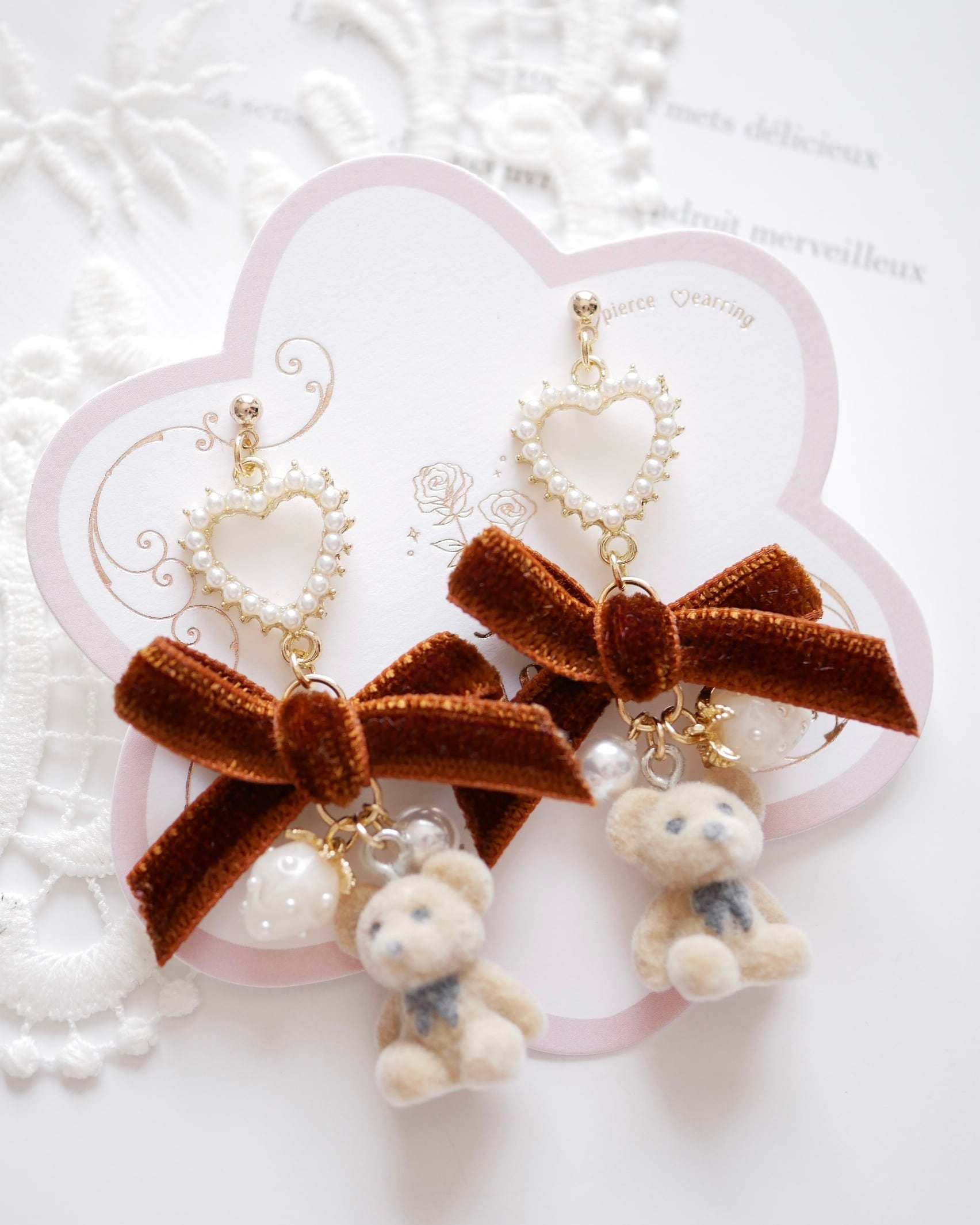 640 ふんわりくまちゃんハートリボンピアス/イヤリング