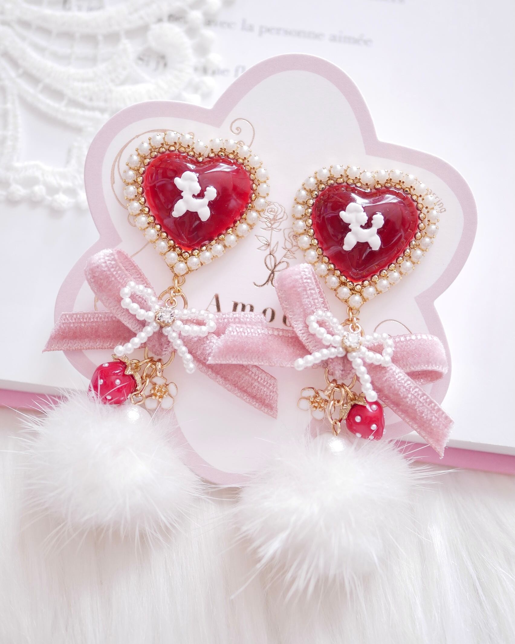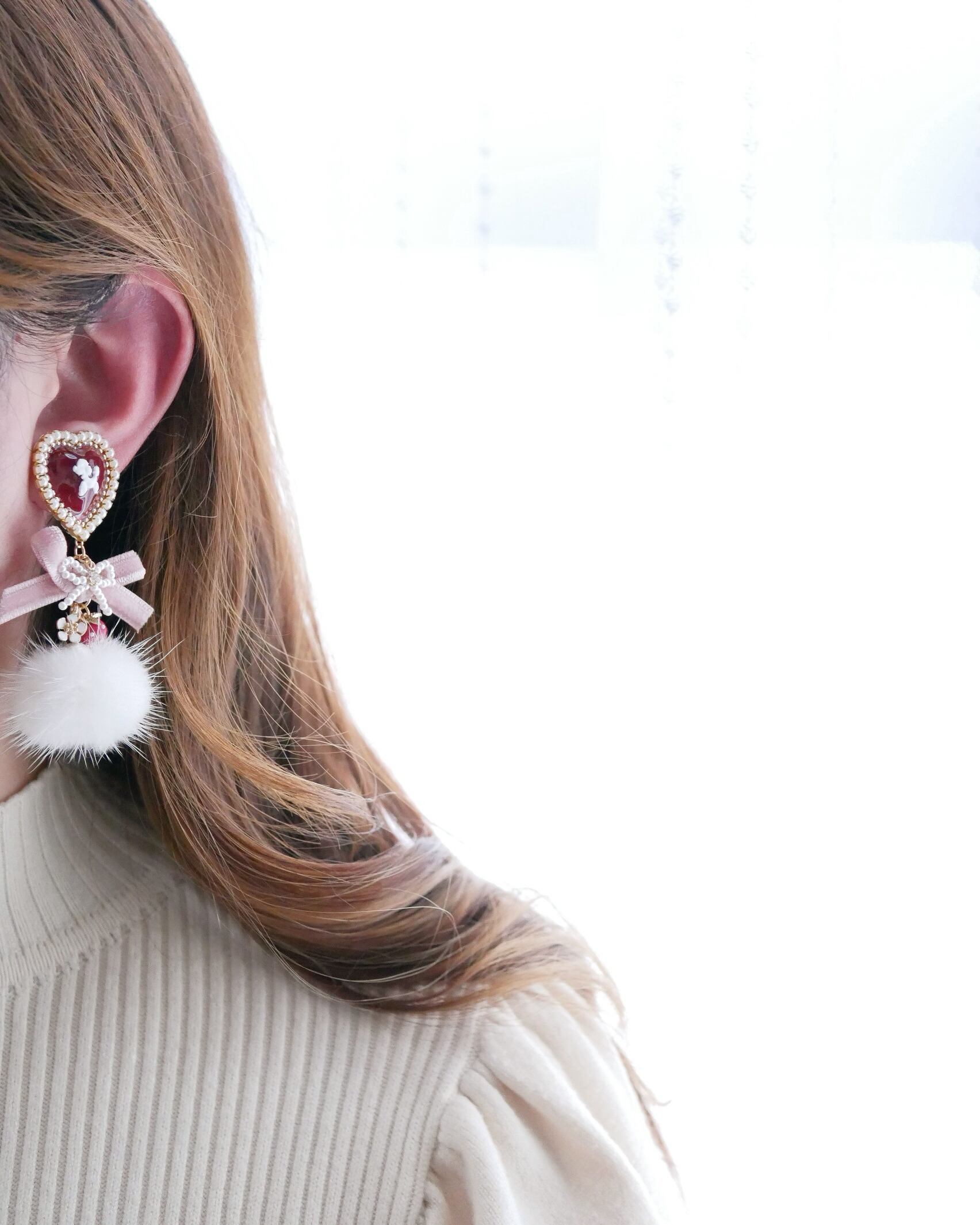 180 プードルハートガーリーリボンファーピアス/イヤリング